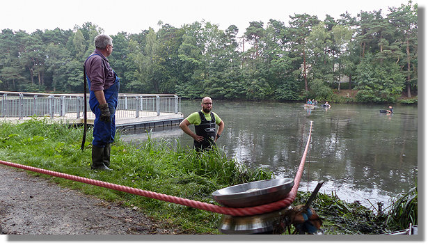 Thomas Stahlsmeier hatte dieses Mal eine neue Umlenkrolle konstruiert und neue Seile besorgt um die Krautharke effektiver über den Teichgrund zu ziehen.