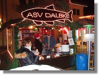 Auch in diesem Jahr war unser Verein wieder auf dem Weihnachtsmarkt in Schloß Holte vertreten. Wir boten neben den inzwischen traditionellen geräucherten Forellen auch noch Brötchen belegt mit Brathering und Bismarckhering an. Außerdem verkauften wir zusätzlich zu Glühwein, Eierpunsch und Heißer Schokolade erstmalig das Detmolder Glühbier, ein noch relativ unbekanntes Getränk bei den Besuchern. Wie immer trafen sich am Donnerstagabend einige Mitglieder um für den nächsten Tag die ersten Forellen in einer Salzlauge einzulegen. Außerdem wurde der Anhänger beladen. Auch dieses Mal mussten ein Kühlschrank, eine Spüle, mehrere Einkochtöpfe, Tische, Bänke, Pavillon und vieles andere mehr, welches in der Weihnachtshütte benötigt wurde, mit. Die eingekauften Getränke, Lebensmittel und andere wichtige Kleinigkeiten wie Tischdecken, Tabletts, Kaffeemaschine, Messer etc. wurden in die Pkws von Achim Kluck und Thomas verstaut. Am anderen Morgen standen Thomas, Alfred Koroll und Manfred Brunzel pünktlich um 8 Uhr im Vereinshaus, um die über Nacht eingelegten Forellen abzuwaschen, abzutrocknen und in portionsweise in Gefrierbeutel zu verpacken. Dann wurde alles zum Weihnachtsmarkt transportiert. Als Thomas mit seinem Pkw plus Anhänger dort ankam, ging er erst einmal zum Frühstücken ins Schloß Cafe. Kurz darauf kam auch schon Uschi. Nachdem sich beide etwas gestärkt hatten ging es ans Ausladen der Autos. Eine Stunde später kamen auch Heike Lindert, Michael Brunzel und Frank Prziwara dazu. Gemeinsam schafften sie die Sachen in die Hütte, schmückten diese weihnachtlich und stellten auf dem Vorplatz Tische und Bänke auf. Gegen 14.30 Uhr traf auch Achim Kluck ein. Nachdem die Hütte eingerichtet und alles an seinem Platz war, füllte Achim den Glühwein und das Glühbier in die Töpfe, damit die Getränke pünktlich zur Eröffnung des Weihnachtsmarktes um 17 Uhr die entsprechende Temperatur hatten. Während Thomas die ersten Forellen räucherte, belegte Uschi schon einmal die Brötchen mit Bismarckheringe und Bratheringe. Heike kümmerte sich inzwischen darum, dass auch die Heiße Schokolade und der Eierpunsch ausgeschenkt werden konnten. Bis zur Eröffnung des Weihnachtsmarktes um 17 Uhr dauerte es noch eine gute Stunde, als schon die ersten Kunden kamen und nach geräucherten Forellen fragten. Ihnen hatten die Fische im letzten Jahr so gut geschmeckt, dass sie gerne wieder welche mitnehmen wollten. Sie mussten aber vertröstet werden, denn noch waren die Forellen nicht fertig geräuchert.
