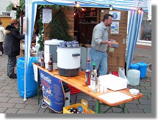 Da das Geschäft wegen dem schlechten Wetter nicht besonders gut lief, räumten Achim, Uschi und Dirk gegen 21 Uhr wieder alles in die Verkaufshütte. Danach waren alle froh, endlich ins Warme zu kommen und die Beine ausstrecken zu können. An allen drei Tagen besuchten bedauerlicherweise wieder nur einige wenige Vereinsmitglieder unseren Stand. Vielleicht gingen sie ja lieber auf einen der vielen anderen Weihnachtsmärkte, die zur gleichen Zeit in den Nachbarstädten stattfanden. Am Sonntagmittag sah das Wetter zuerst etwas besser aus. Anfangs war es noch trocken, doch schon bald kamen die ersten Schauer.